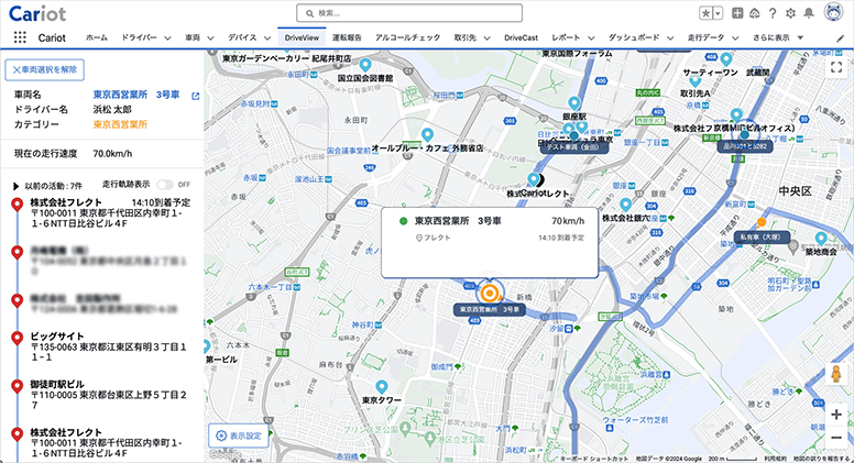 Cariotには「DriveView」という機能があり、車両が今どこを走行しているかをリアルタイムで確認可能です。