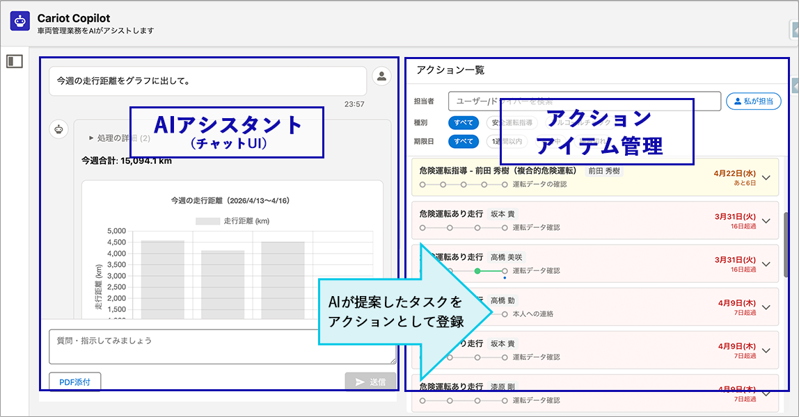AI車両管理ポータル「Cariot Copilot(キャリオットコパイロット)」は、従来の車両管理を進化させるAIアシスタント機能です。 データの集計・分析から、見落としが許されないチェック業務まで、手間のかかるルーチンワークをAIが徹底して代行・支援します。