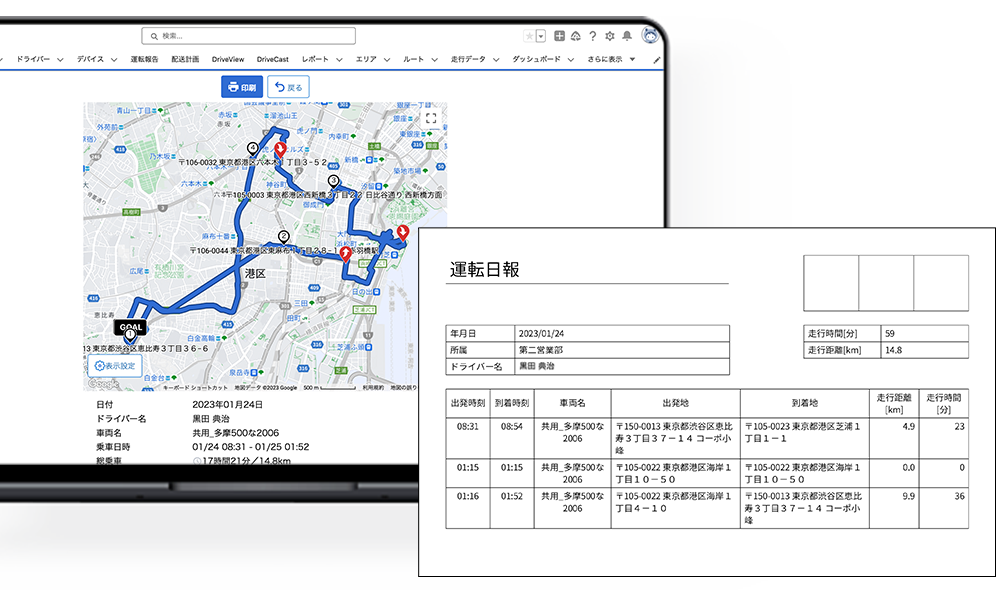 走行データに溜まった、時間、距離、拠点などの情報を運転日報作成に活用。
